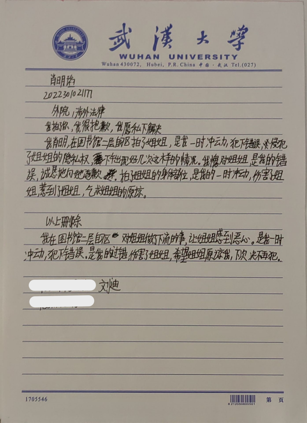 “我肖明,在图书馆二层自习区拍了姐姐,是我一时冲动,犯下错误,侵犯了姐姐的隐私权,下午出现好几次这样的情况。我愧对姐姐,是我的错误,诚恳地向她道歉,拍了姐姐的身体部位,是我一时冲动,伤害了姐姐,惹到了姐姐,乞求姐姐的原谅。”