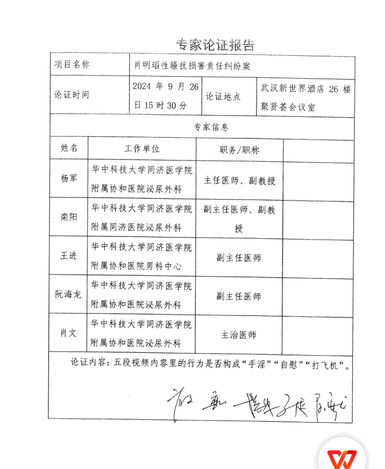 2024年9月26日:华中科技大学同济医学院附属协和、同济医院的泌尿外科和男科中心的主任医师、副主任医生、副教授、主治医生等五人在武汉新世界酒店26楼聚贤芸会议室讨论「五段视频内容里的行为是否构成“手淫”“自慰”“打飞机”」,这五位医生分别是杨军、栾阳、王进、肖文、阮海龙。