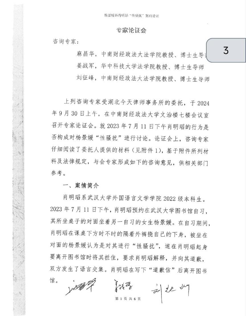 2024年9月30日:中南财经政法大法学院、华中科技大学法学院的教授和博士生导师等三人在中南财经政法大学文治楼七楼会议室召开专家论证会,讨论「2023年7月11日下午肖明瑫的行为是否构成对杨景媛“性骚扰”」,这三位老师分别是麻昌华、姜战军、刘征峰。