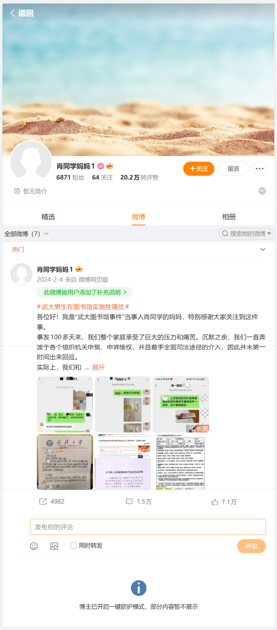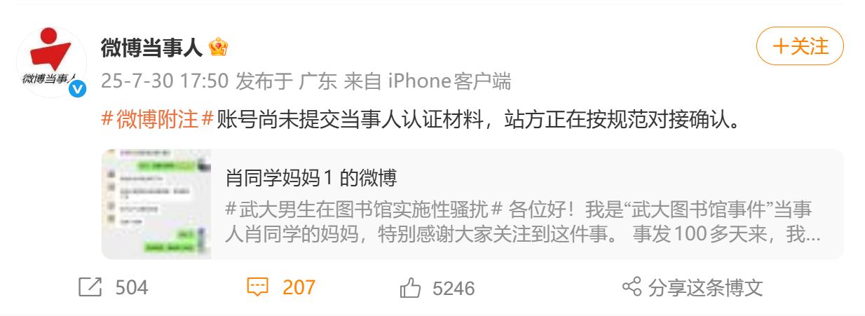 2025年7月30日:微博官方账号@微博当事人 称正在和@肖同学妈妈1 完成微博当事人认证程序。截至合订本发布为止,认证程序仍未完成。
