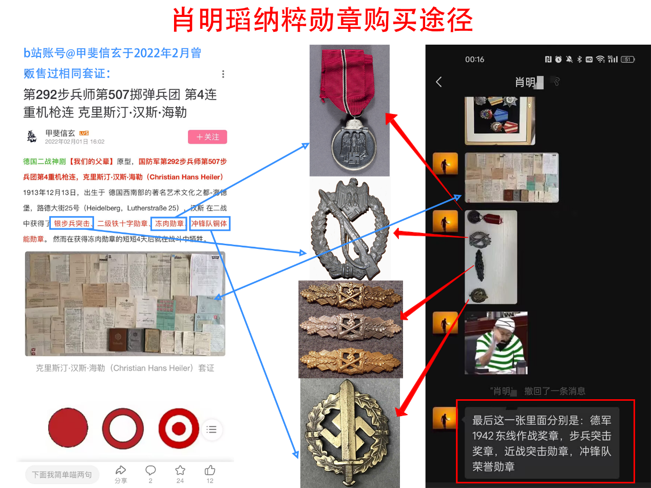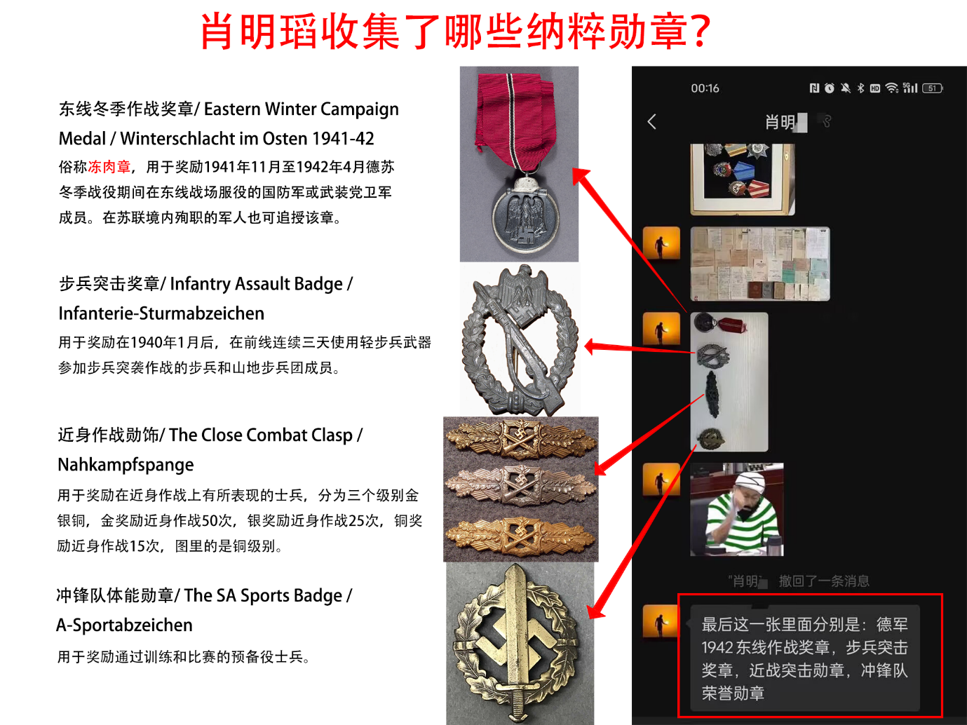 • 当肖方造谣杨景媛收所谓的女权NGO的脏钱时,肖明瑫才是那个收藏纳粹徽章,行纳粹礼,偷窥女厕,违规送保,在各个方面都无法通过德行检验的人;