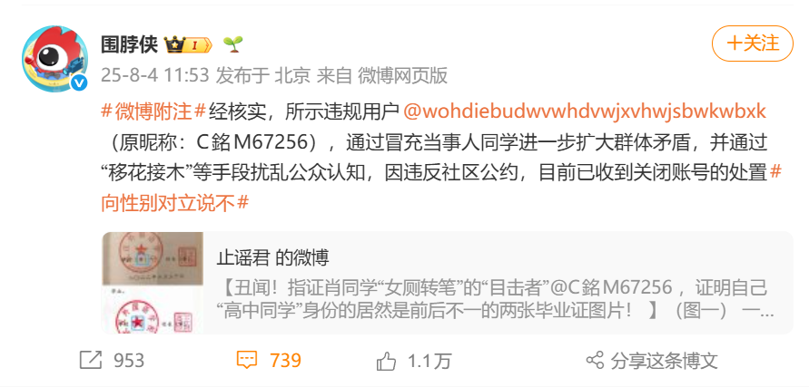 2025年8月4日:@围脖侠 以“通过冒充当事人同学进一步扩大群体矛盾,并通过移花接木等手段扰乱公众认知”为由封禁了@C銘M67256 。