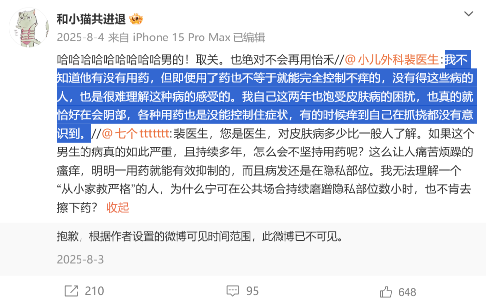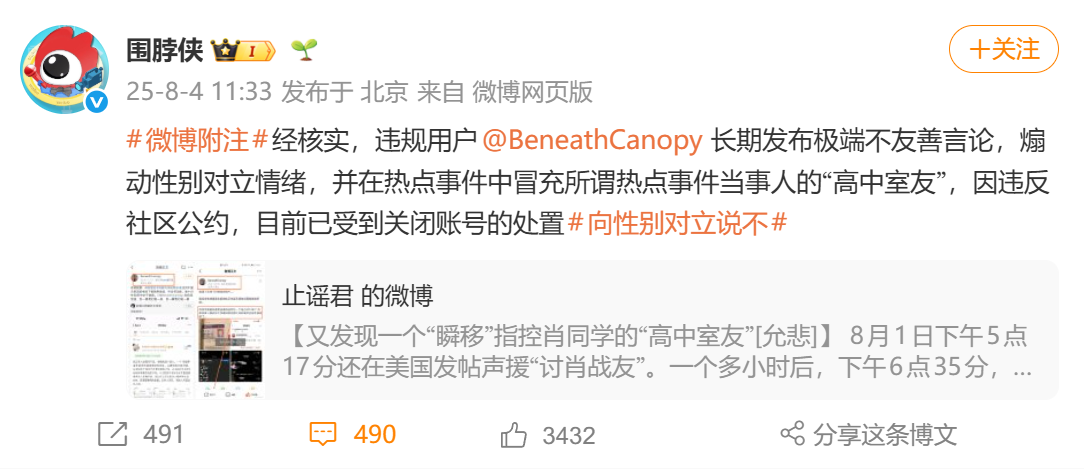 2025年8月4日:@围脖侠 以“长期发布极端不友善言论,煽动性别对立情绪,并在热点事件中冒充所谓热点事件当事人的高中室友”为由封禁了@BeneathCanopy 。