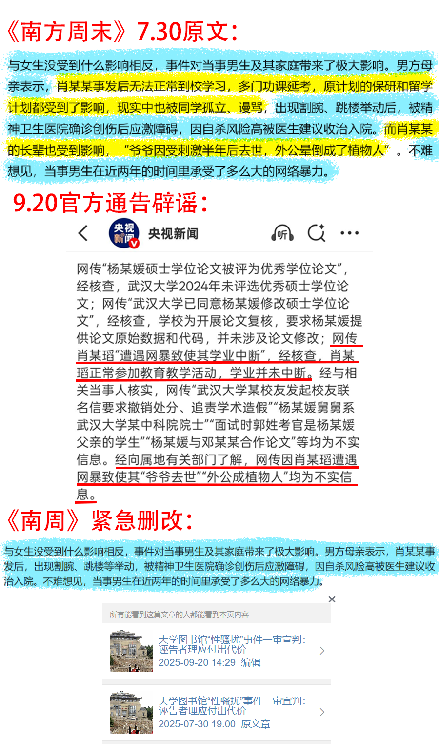 2025年9月20日,武汉大学发布通告,宣布对杨景媛硕士学位论文的调查结果,并撤销2023年给予肖明瑫的处分。就此,此事在政府层面告一段落,舆论进一步收紧,大量讨论被删除、屏蔽,相关账号被禁言、注销,现在再回头去搜索相关内容,已经只剩官方说法了。