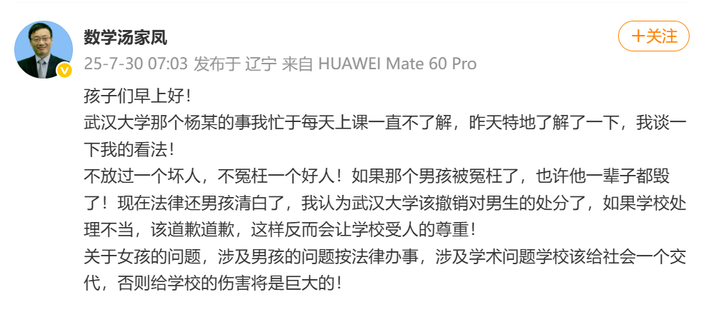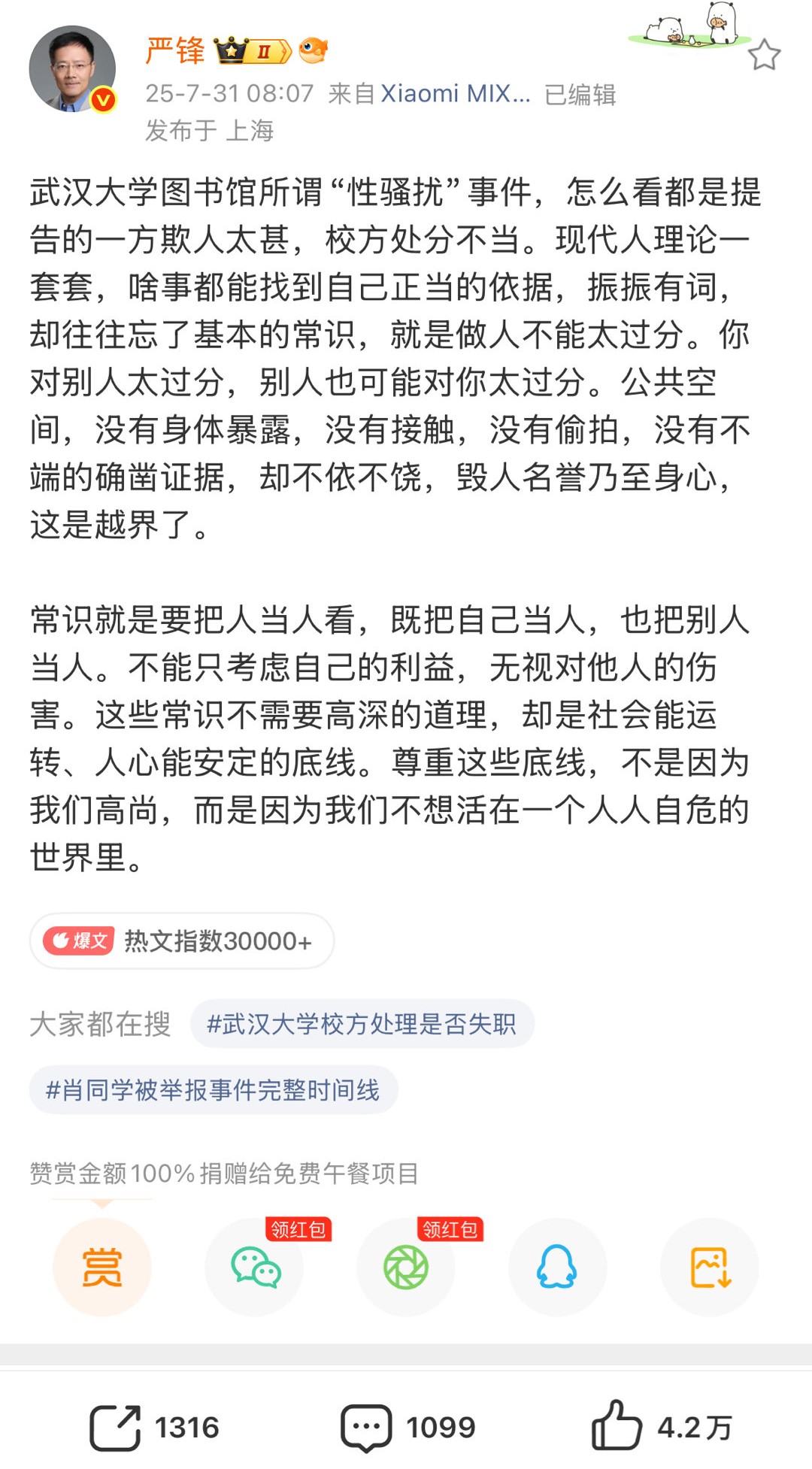 2025年8月1日:武汉大学发布通告,称“已组建工作专班,正在对肖某某纪律处分、杨某某学位论文等进行全面调查复核。”