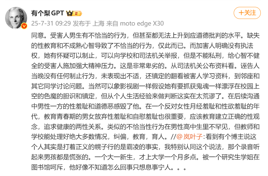 而诸如PTSD、自杀倾向等添油加醋的部分,只不过是又一次加害者表演罢了:加害者会一直表演到自己都信了自己是受害者。而人们又太在意一个20岁的已成年“男孩”的未来;他*考*上了武大,他前途光辉,他要入党、保研、评优,他的前途不能被一个应激了的女的毁了,哪怕那个女的同样前途光辉,成绩优秀。在这件事里,你真的能感觉到中国社会方方面面对于那根鸡巴有多看重。