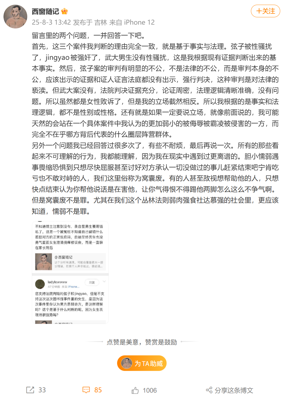 而这些男性如此热情且不顾一切地支持肖明瑫,其间的心态也很值得我们思考:当此类性犯罪发生时,从群体角度来说,最好的是和犯罪者割席,以此向别的群体证明正常男人没有问题,有问题的是这些犯罪者。