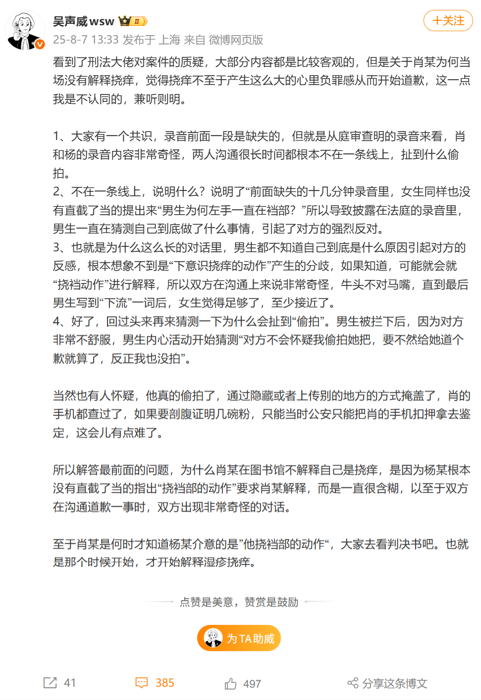 而虽然没有录音,我们依然可以推测出来,杨景媛当时一定没有直接说出她认为肖明瑫在对着她自慰,否则肖明瑫在道歉信里自认的就不会是偷拍的事情了。相反,杨景媛想指控肖明瑫在图书馆内对着她自慰,肖明瑫却以为杨景媛在指控自己偷拍她,故在道歉信里认罪。